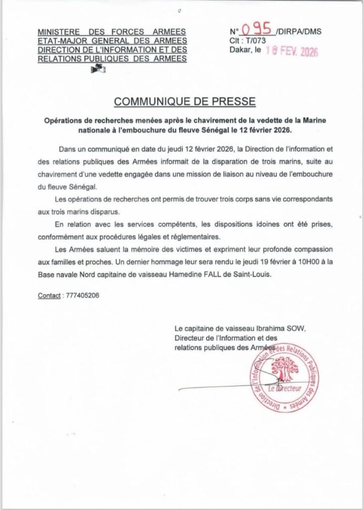 Les forces armées du Sénégal ont annoncé ce 18 février 2026 avoir retrouvé les corps des trois marins portés disparus après le chavirement d’une vedette de la Marine nationale survenu le 12 février à l’embouchure du Fleuve Sénégal.