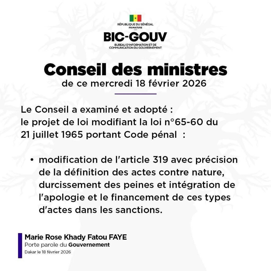 Le Conseil des ministres a adopté ce mercredi un projet de loi modifiant l’article 319 du Code pénal, relatif aux « actes contre nature ». Cette réforme précise la définition des infractions, durcit les peines et intègre l’apologie ainsi que le financement de ces actes dans le champ des sanctions. Elle survient dans un contexte marqué par plusieurs affaires judiciaires très médiatisées, qui ont fortement mobilisé l’opinion publique.